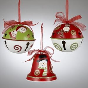 Distinctive jingle bell ornaments with snowmen faces are accented with gleaming green and red glitter