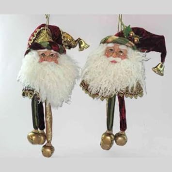 Plush Victorian style Santa Claus ornaments feature dangling jingle bell accents