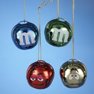 Jingle bell ornaments each feature an iconic M&M face and the M&M logo
