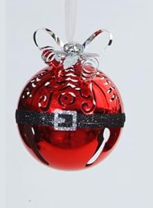 This jolly ornament features stars, Christmas trees and the word "joy" punched into a bright and shiny red jingle bell with a black glittered Santa Claus belt, and is topped with a beautiful silver metal bow and miniature silver jingle bell accents
